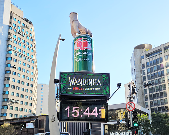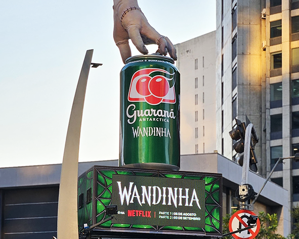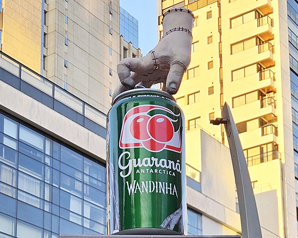 Para mostrar ao público a incrível parceria de Guaraná e Wandinha, colocamos um relógio de rua para levar essa temática às ruas de São Paulo. A face do relógio foi substituída pela icônica “mãozinha” da série abrindo a lata de guaraná, a partir de um mecanismo de movimento