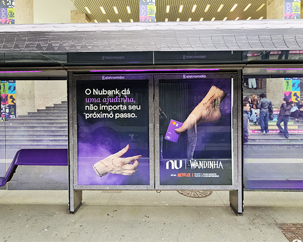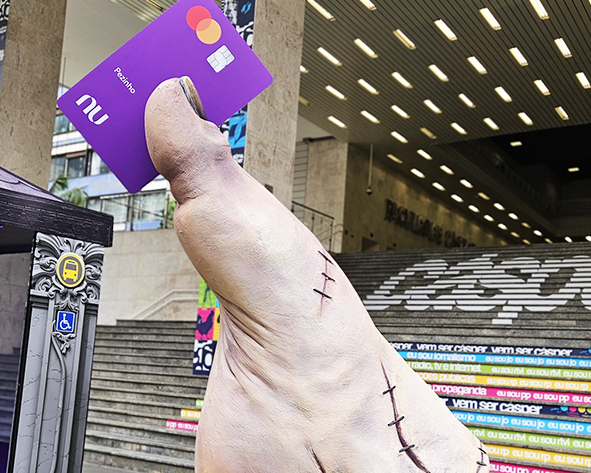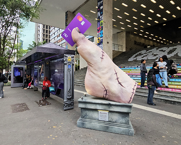 Nubank transformou a icônica “mãozinha” em um pézinho, para sua nova campanha. A cenografia do pezinho gigante “segurando” um cartão Nubank foi instalada em um abrigo na Av. Paulista, o qual leva toda a temática de mistério da série em sua ambientação.